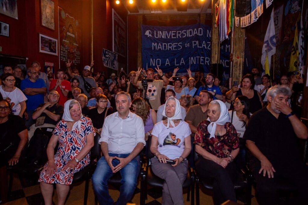 “Venimos de de una plaza hermosa, maravillosa, qué contenta estaría Hebe que Axel, el Gobernador de la Provincia de Buenos Aires, estuvo en su cumpleaños”, indicó en el comienzo del acto en referencia a la presencia de Kicillof en la Plaza de Mayo durante la Marcha 2486. “Y para arrancar no quiero decir una palabra sin antes mencionar una cosa que me parece fundamental: tenemos que devolverle la Universidad a las Madres”, indicó en referencia a la ilegal intervención de la UNMa por parte del gobierno de Milei.